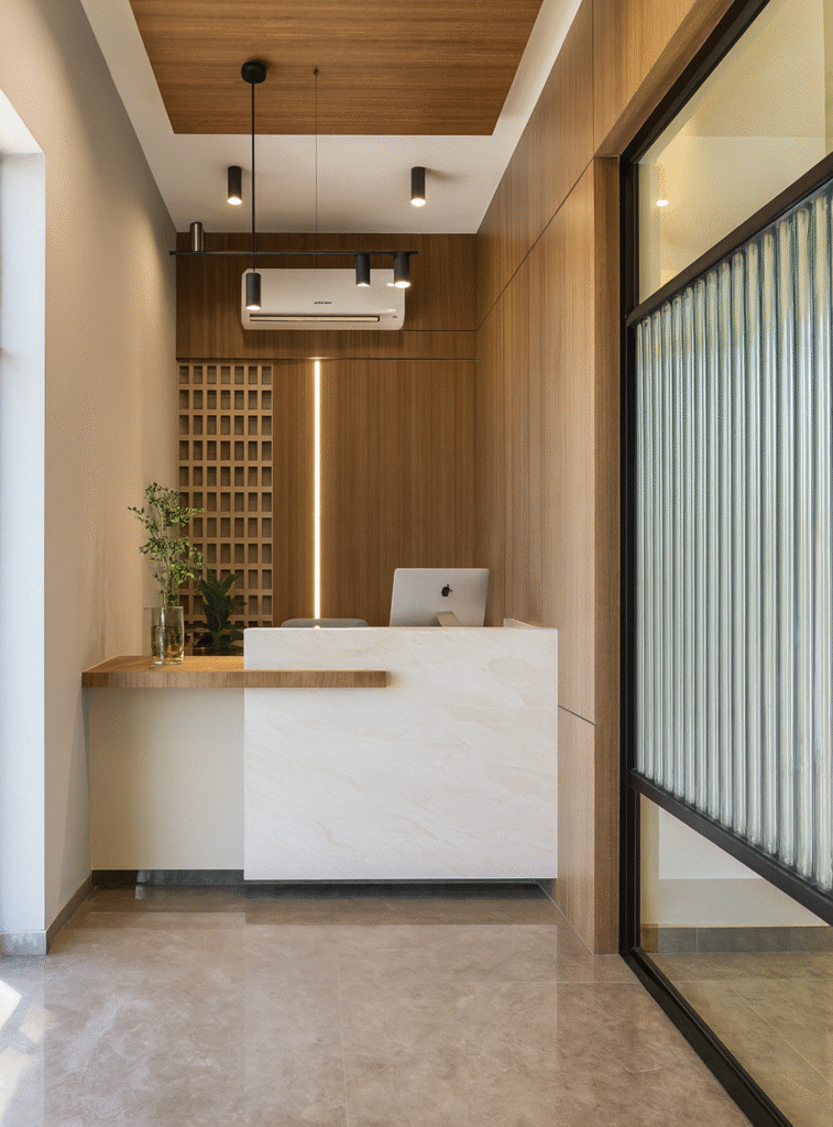 The Haswani Handicrafts Office is envisioned as a refined, modern workspace that balances functionality with understated elegance.