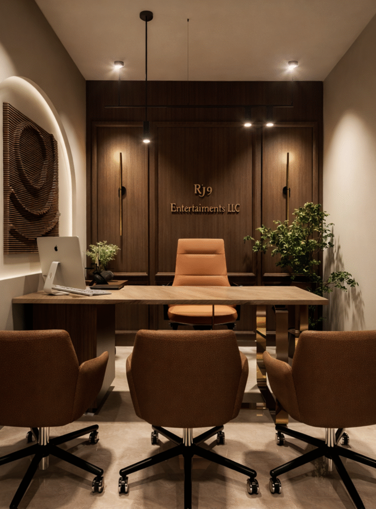 The RJ19 Entertainments Office is a compact 750 sq. ft. workspace crafted to reflect the dynamic spirit of an event management company .