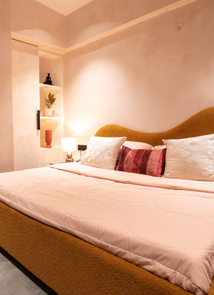 Sanskriti 504 is a thoughtfully designed 2 BHK apartment envisioned around a tropical theme. The interiors are unified through a continuous micro-cement finish in rich red terracotta tone.