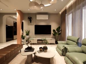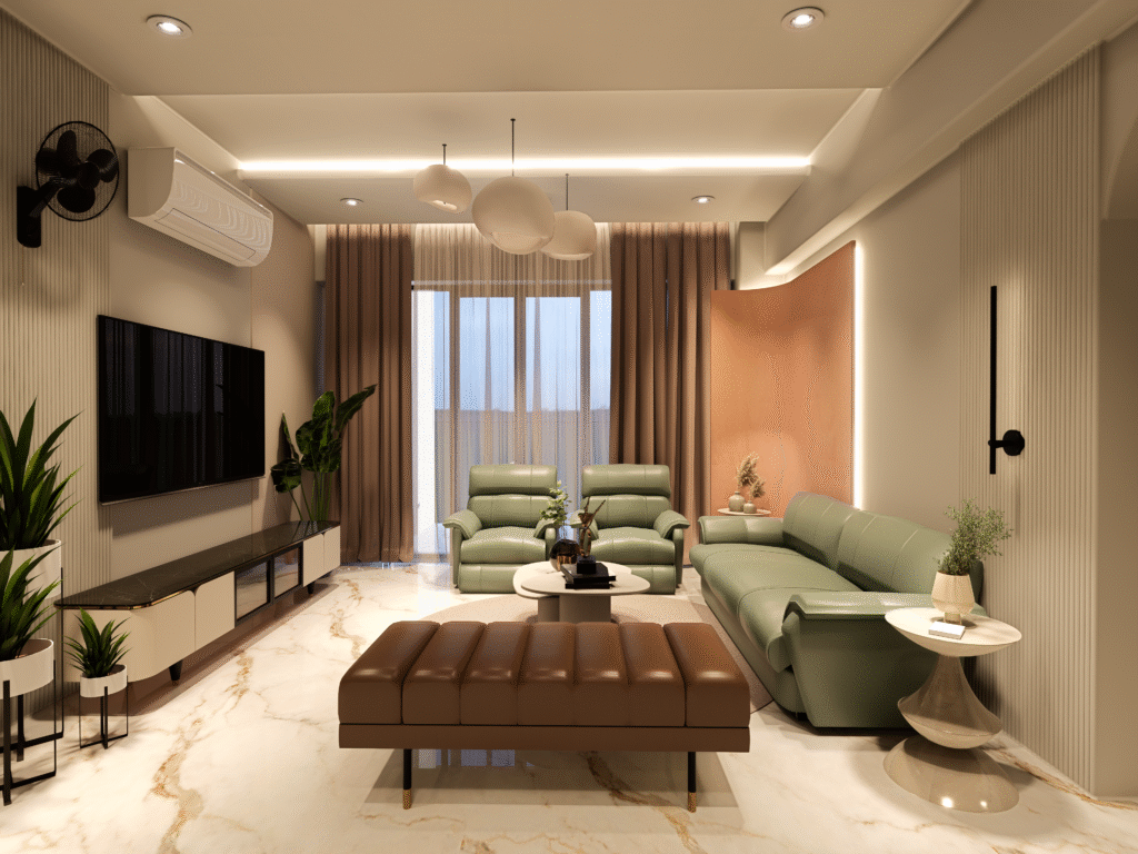 The living area is conceived as the heart of the home, where form and function come together effortlessly. Plush seating in soothing hues is complemented by warm accent tones and layered lighting that enhances depth without visual clutter. Natural light filters through sheer drapery, softening the space and highlighting the material richness—from polished marble floors to subtly textured wall finishes. The result is a welcoming environment designed for both intimate family moments and relaxed entertaining.